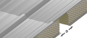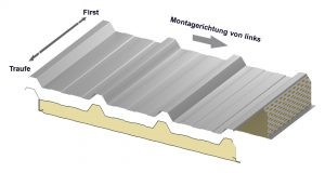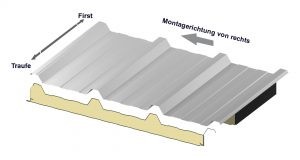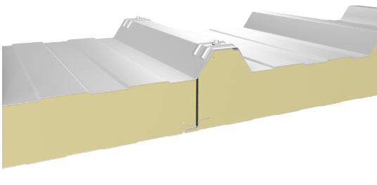 Sandwichplatten fürs Dach mit einem Kern aus Mineralwolle haben eine spezielle Verbindung, die ihre Feuerbeständigkeit erhöht. Die gefräste Wolle an den Stößen verbessert die Wärmedämmung und Dichtigkeit.